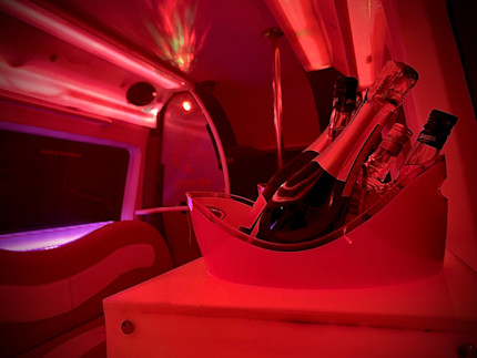 🍾 Schon beim Einsteigen beginnt das Erlebnis: Nebelmaschinen, bunte LED-Lichter und eine leistungsstarke Musikanlage sorgen für das perfekte Partyfeeling. Ob drei Flaschen prickelnder Cava oder 15 gut gekühlte Biere – ihr habt die Wahl.